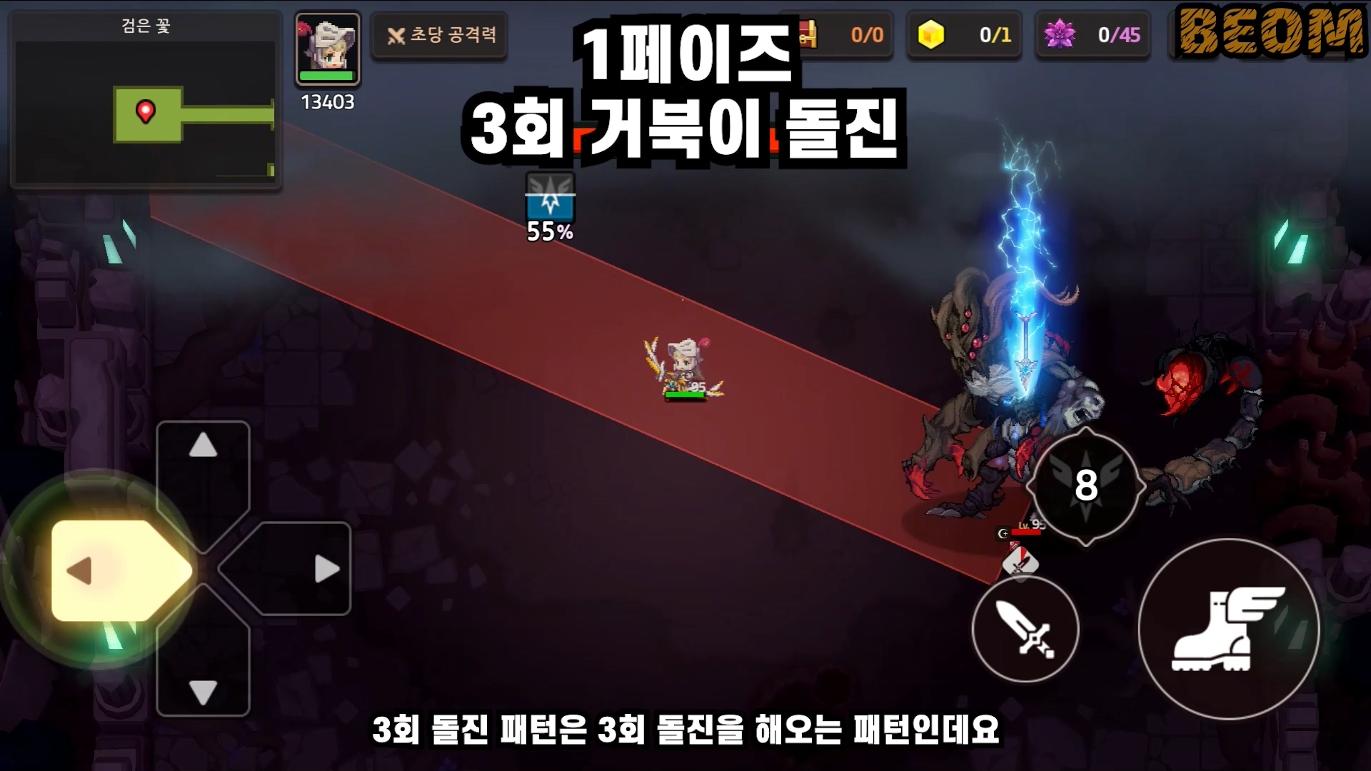 3회 추락 후에 잠시 기사를 그로기 상태로 만듭니다. 이 패턴을 보고 아주 살짝 긴장했는데 그 뒤에 후속 공격이 없어서 결국은 별거없는 패턴입니다.