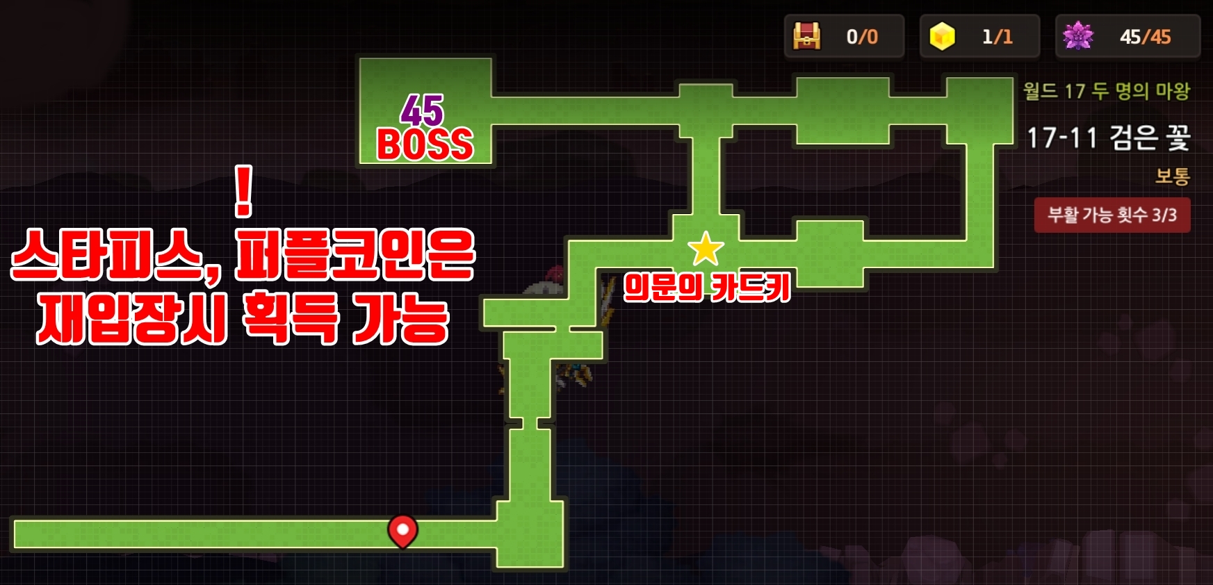자, 이제 마지막 17-11 검은 꽃 스테이지까지 왔습니다. 여기는 보스를 조지고 다시 들어오면 의문의 카드키와 이것 저것을 드실 수 있는데 그것보다는 보스 패턴을 살펴보는게 중요할 것 같습니다. 아마 아무리 못해도 최대 30~60보석 사이에서 끝낼만한 난이도지만 하나도 안 쓰시도록 살펴보겠습니다.